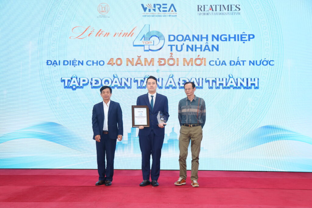 Ngày 8/10/2025, Tập đoàn Tân Á Đại Thành vinh dự được xướng tên trong Top 40 Doanh nghiệp tư nhân tiêu biểu sau 40 năm Đổi mới, trở thành đại diện tiêu biểu cho khát vọng phát triển của doanh nghiệp Việt trên hành trình đồng hành cùng đất nước. Chương trình do Tạp chí điện tử Bất động sản Việt Nam (Reatimes) và Viện Nghiên cứu Bất động sản Việt Nam (VIRES) tổ chức, dưới sự chỉ đạo của Hiệp hội Bất động sản Việt Nam, nhân dịp 21 năm Ngày Doanh nhân Việt Nam. Đại diện Tập đoàn, ông Nguyễn Anh Tú – Phó Tổng Giám đốc Thường trực, đã tham dự và nhận biểu trưng tôn vinh từ Ban Tổ chức.