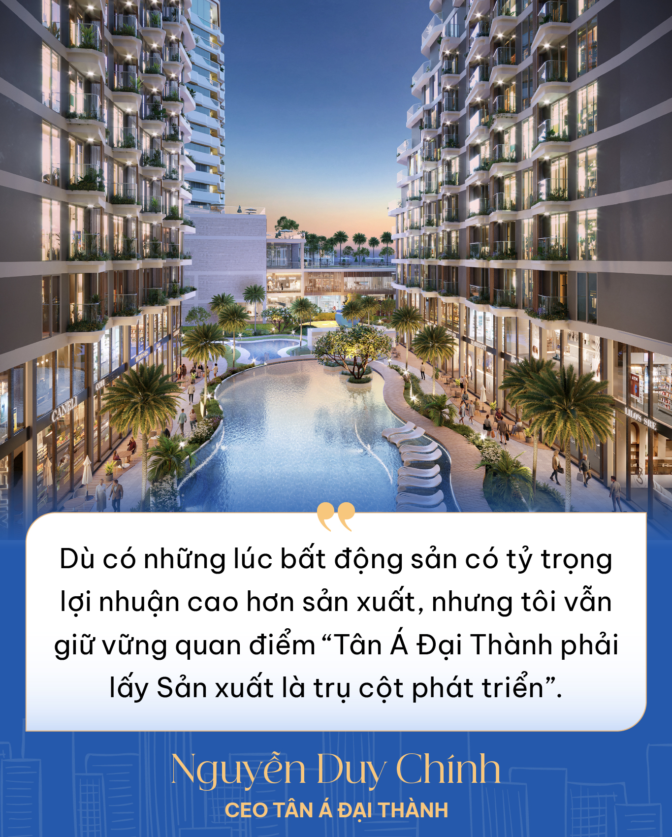 Đúng vậy! Khi làm việc với các đơn vị tư vấn, kể cả trong quá trình chuẩn bị IPO, câu hỏi đầu tiên họ đặt ra luôn là: “Nói đến Tân Á Đại Thành là nói đến cái gì?” Có rất nhiều ý kiến đề xuất định vị thành doanh nghiệp bất động sản vì lúc đó tỷ trọng lợi nhuận của bất động sản cao hơn sản xuất, và bất động sản đang nóng. Nhưng tôi là người phản đối mạnh mẽ nhất. Tôi bảo: “Không được. Nói đến Tân Á Đại Thành vẫn phải nói đến Sản xuất”.